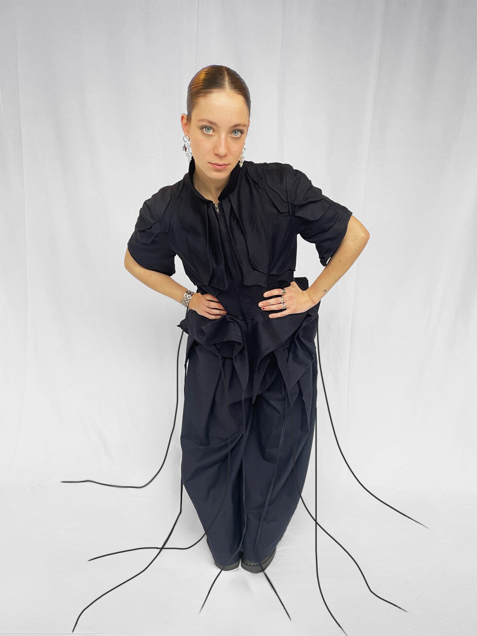 Lucie Poupon, based in Paris, creates oversized, gender-neutral pieces that explore volume and freedom of movement. Focused on bespoke, she values the direct connection with the people who wear her designs. Having honed her skills in sewing and pattern-making since her teens and currently studying fashion design in Paris’ 11th arrondissement, she draws inspiration from art and the study of silhouettes, constantly seeking to reshape form and reimagine the possibilities of clothing.